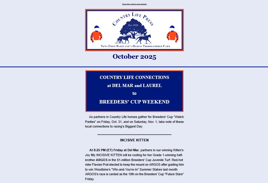 Breeders Cup connections; Amie's Symphony's 3rd win; Yearling partnership offerings: 24 Make Amends and 24 Jennemily; MD Million recap, CLF-sired winners.