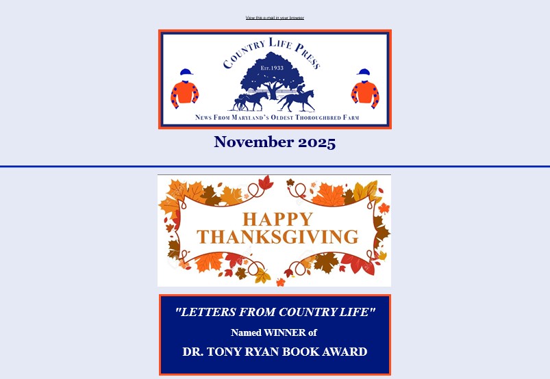 Letters from Country Life book release, MHBA Yearling Show, Colonial Downs stakes win for Fulmineo, CLF-sired winners