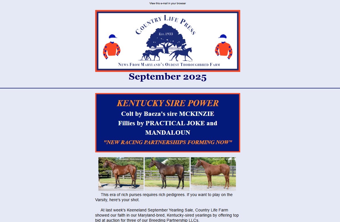 Letters from Country Life book release, MHBA Yearling Show, Colonial Downs stakes win for Fulmineo, CLF-sired winners