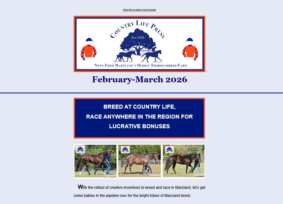 Breeding in MD/CLF stallion success, Mares in KY being bred, Pony Races at ML, CLF-sired winners.
