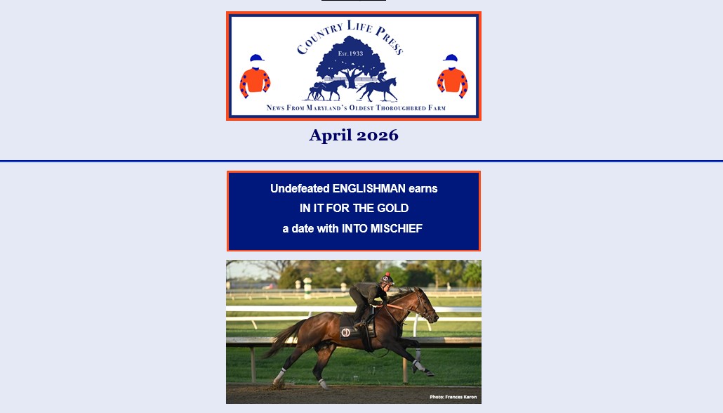 FF's Passion Rules possible Preakness and Mosler's Quint's Brew possible Preakness card stakes; MD Horse Farm Tour 5/11; mares home from KY; March foals; March winners for CLF stallions